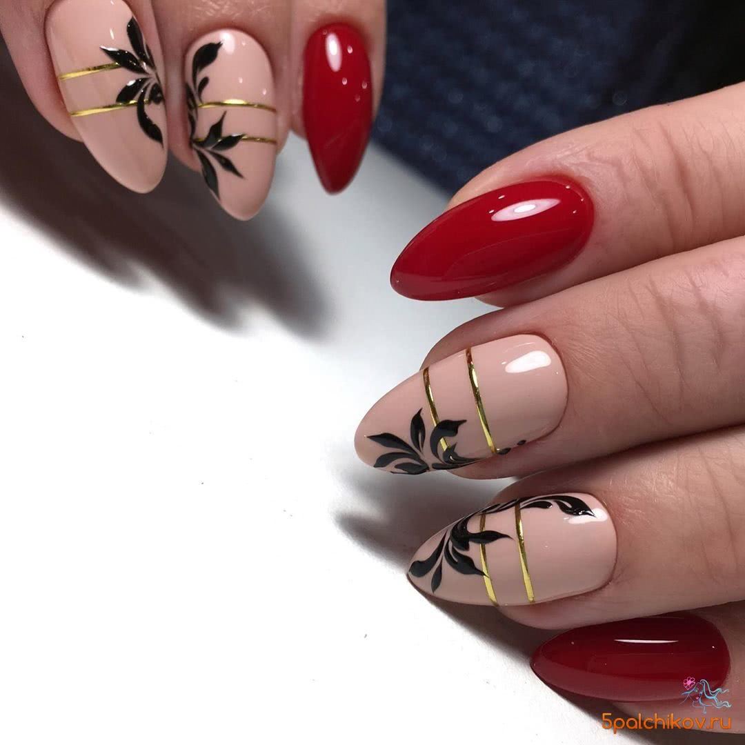 Просто шикарно смотрится бежево-красное оформление ногтей на фото ниже. Оно сочетает в себе несколько техник исполнения: