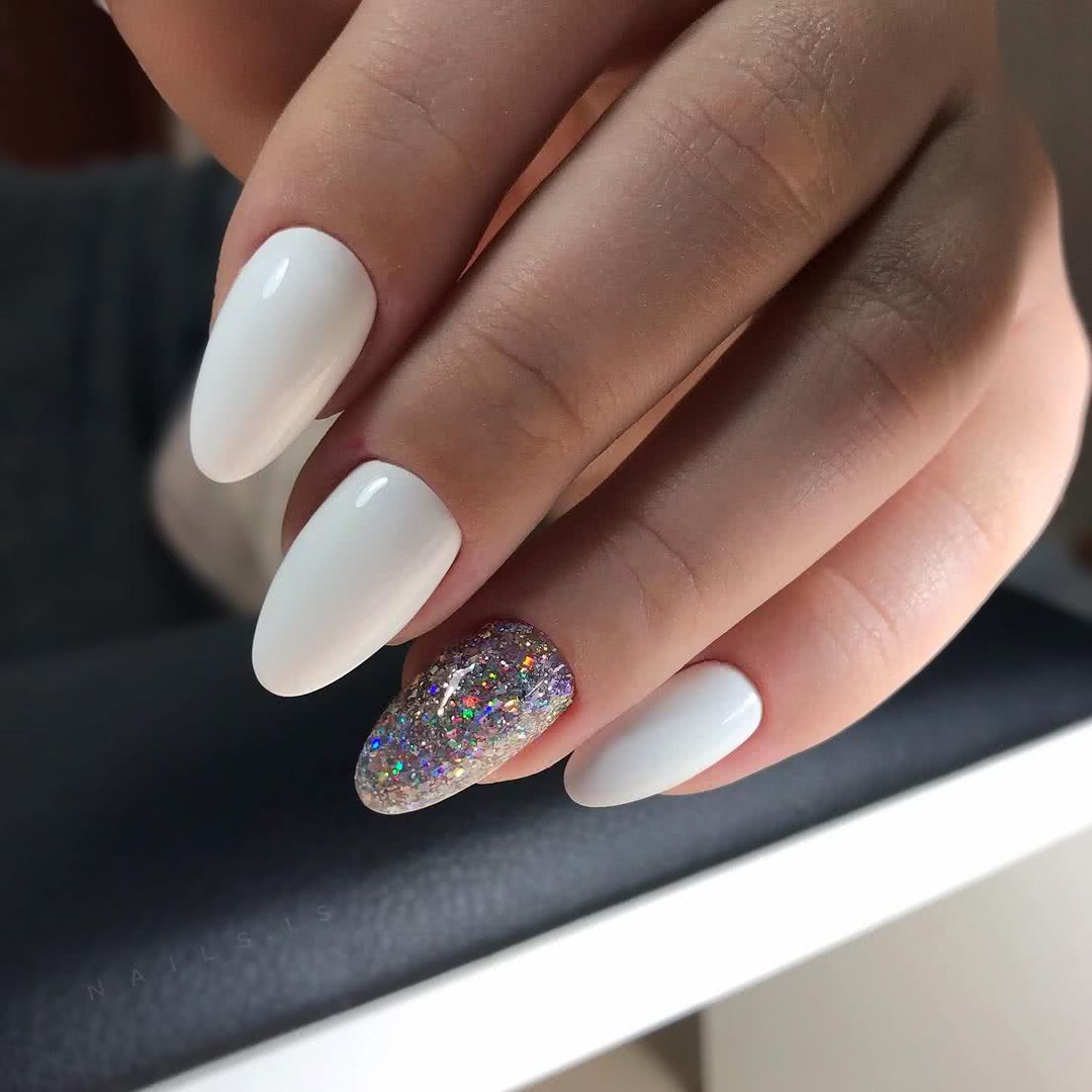 Если небольшой сверкающий акцент не вызывает негативных эмоций, почему бы не выделить один ноготь на руке с помощью блестящей пудры?! Важное условие — на соседние ноготки будет наложен стандартный глянцевый лак или гель. Перламутровое покрытие с сияющими микрочастицами — тоже простой, но привлекательный вариант нейл-дизайна