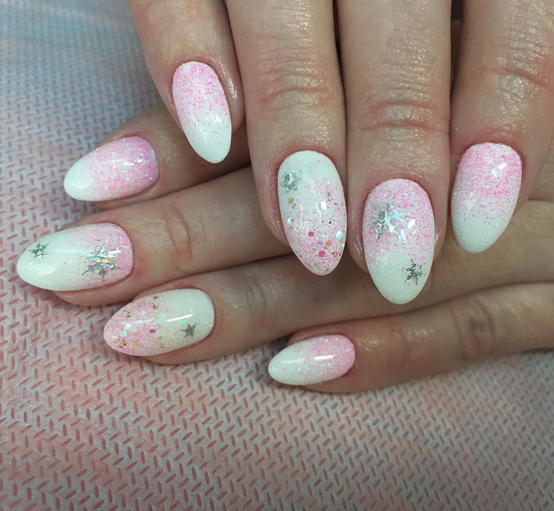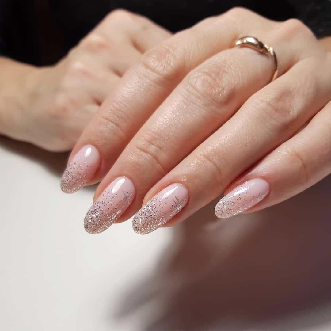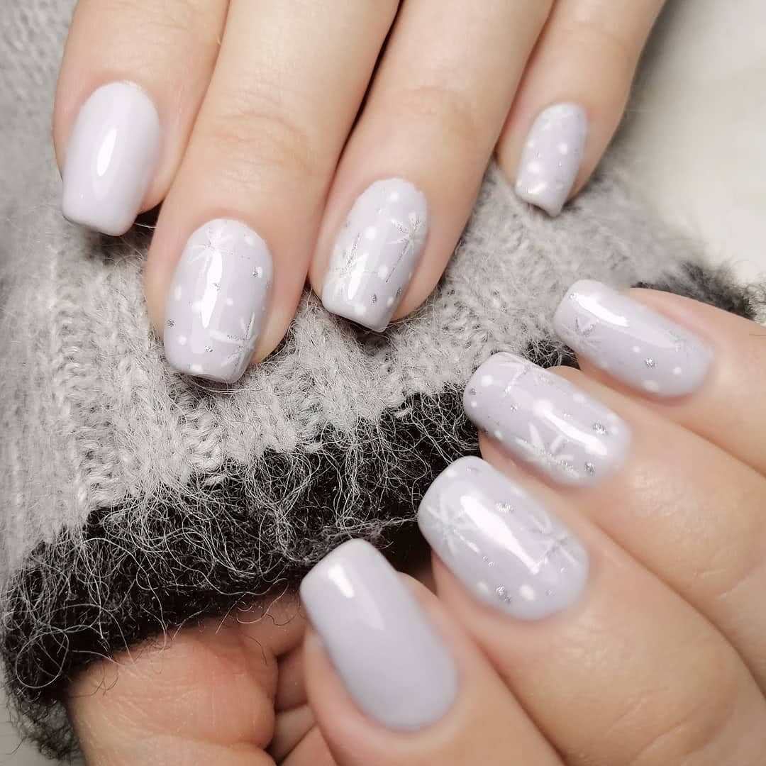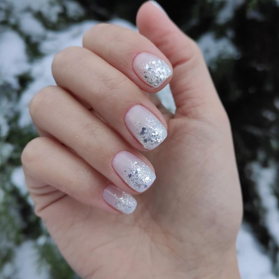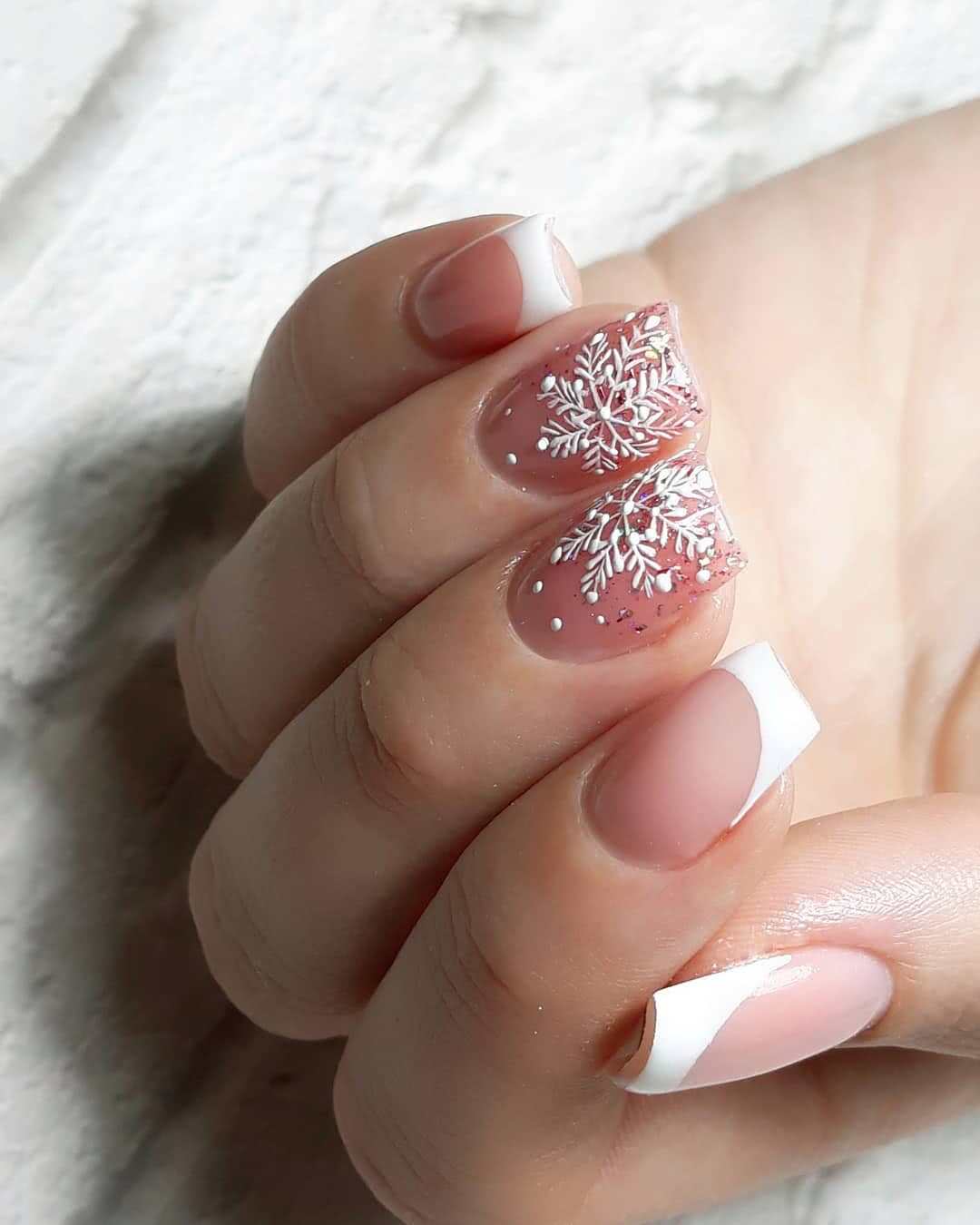 Нежно и модно смотрится классический белый нежный френч в сочетании с блестками и снежинками.