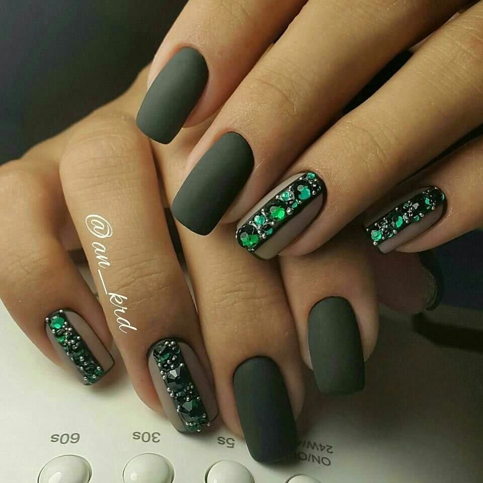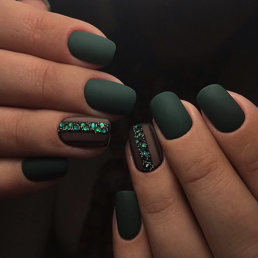 Одним из самых модных цветов этого года стал зеленый. В палитрах многих производителей появилось множество красивых оттенков этого благородного цвета. Зимой более актуальными считаются темные тона. На их основе можно создать красивый матовый маникюр со стразами или новогодней тематикой.