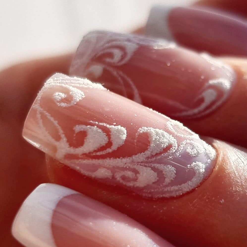 Бархатный песок — вид сухого матового покрытия, завоевавший популярность, и не утрачивающий ее. Прием с его наложением на ногти — тоже великолепная новогодняя нейл-идея. Превосходный маникюр на Новый год 2021 — белый бархатный песок на ноготках, имитирующий пушистый снег.