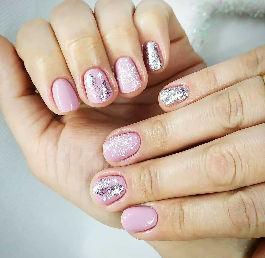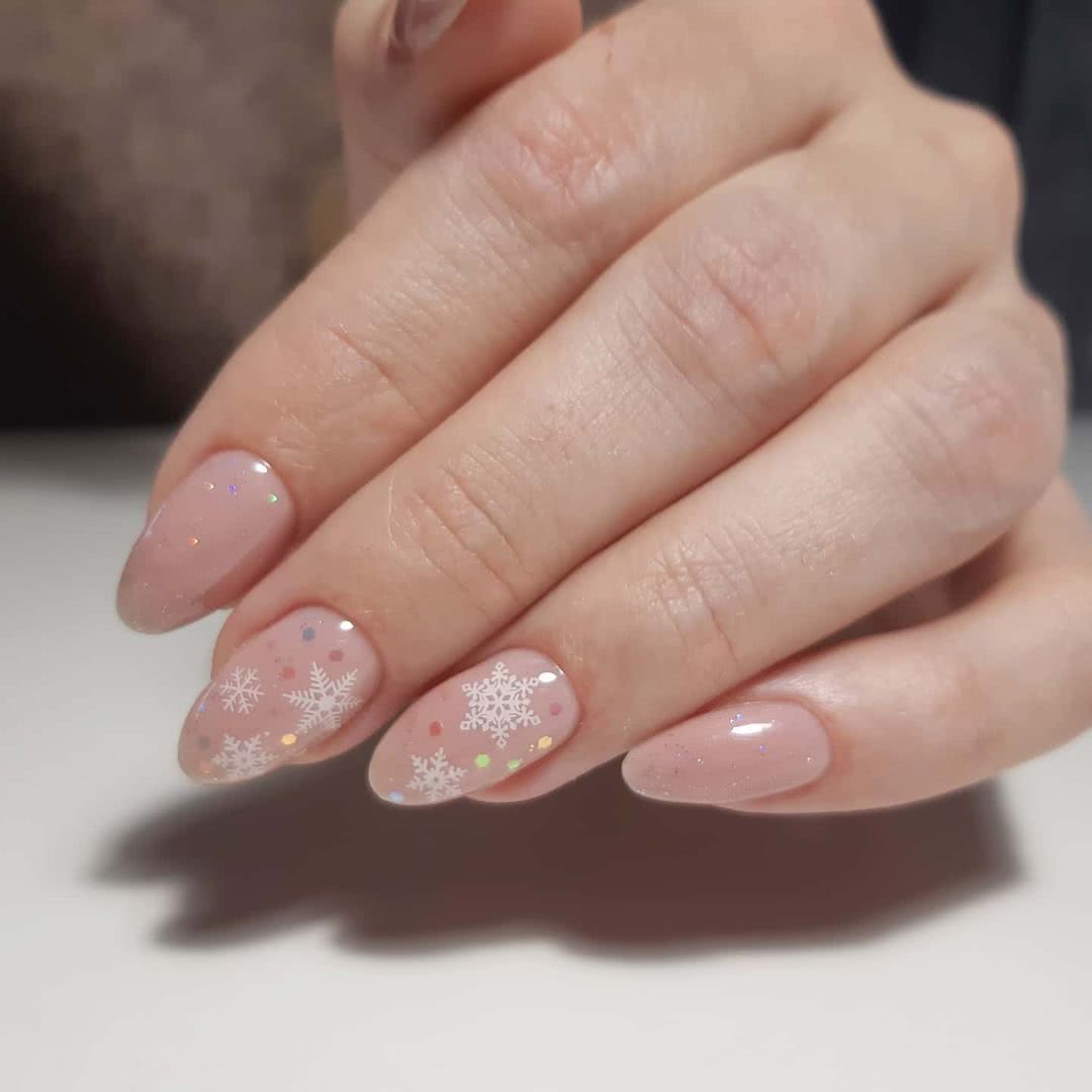 Ниже представлена очень интересная идея — нюдовый маникюр со снежинками. Едва заметные рисунки как нельзя лучше отражают зимнюю тематику, при этом не выглядят слишком навязчиво. Ну чем не идея для нового года? Модно, сдержанно и со вкусом.