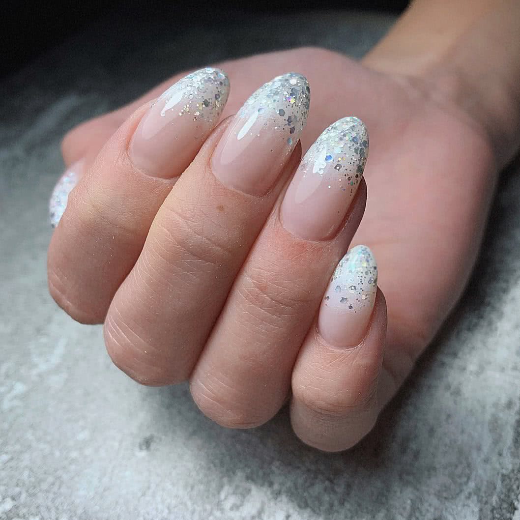 Если хочется красивых переходов на ноготках, то смело делайте градиент. Кроме того, в этом праздничном сезоне очень модно поверх цветного градиента, дополнительно делать легкую растяжку серебряными блестками. Это выглядит очень стильно и нарядно.
