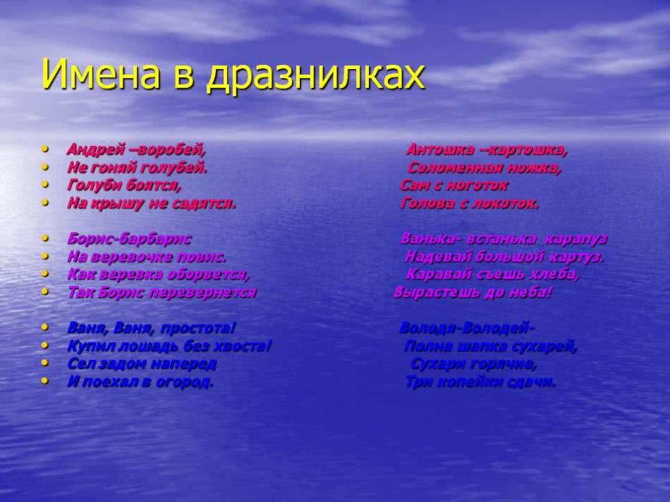 Чтобы понять дразнилки, надо знать и понять их историю. Дразнилки существуют с очень давнего времени и до наших дней дошли дразнилки почти ко всем русским именам.