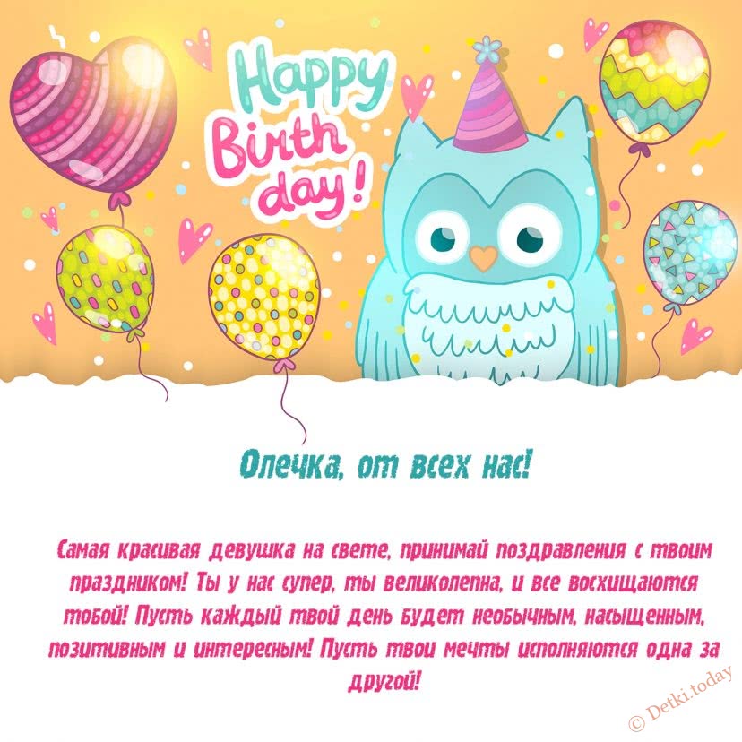 Оленька, милая наша, родная, Тебя мы поздравить сегодня спешим. С Днем рождения, дорогая, Желаем мы счастья от всей души.