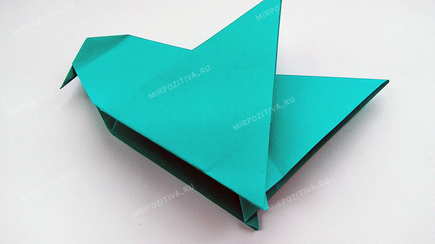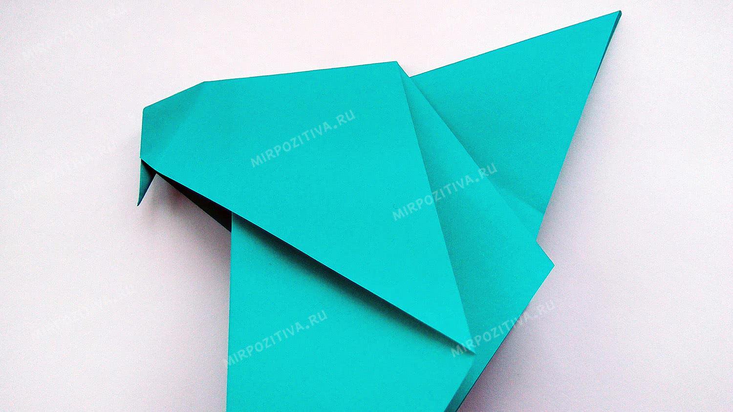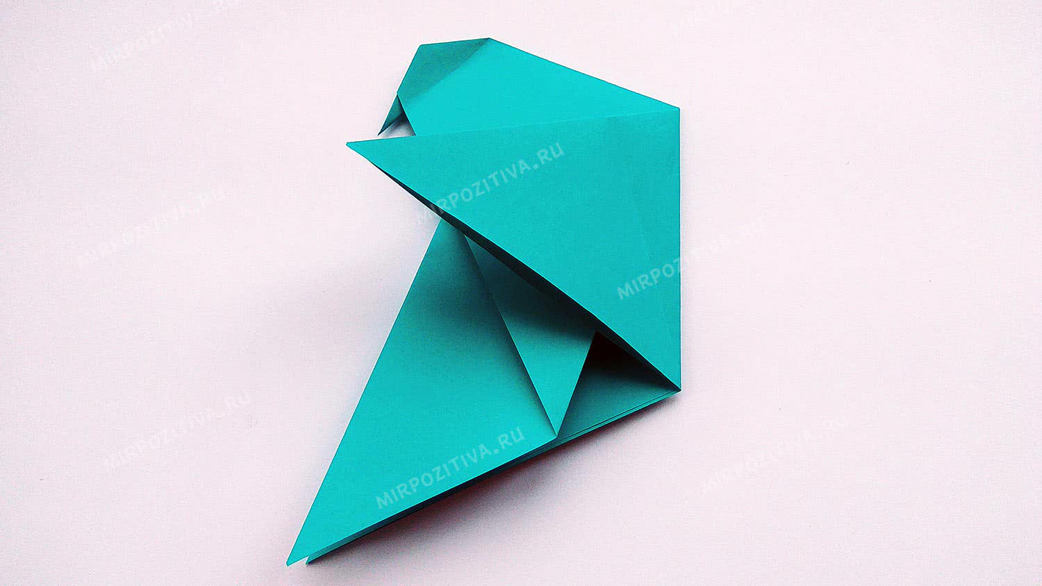 Шаг 13. Разгладьте бумагу в таком виде, и фигурка уже похожа на птицу. Есть широкая голова с маленьким острым клювом, есть 2 больших крыла, хвост, а внизу пока выделены выступы ног.