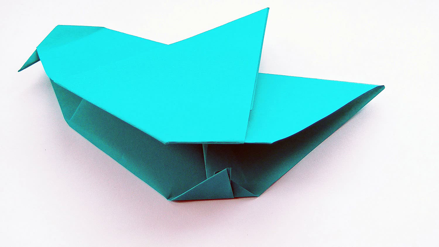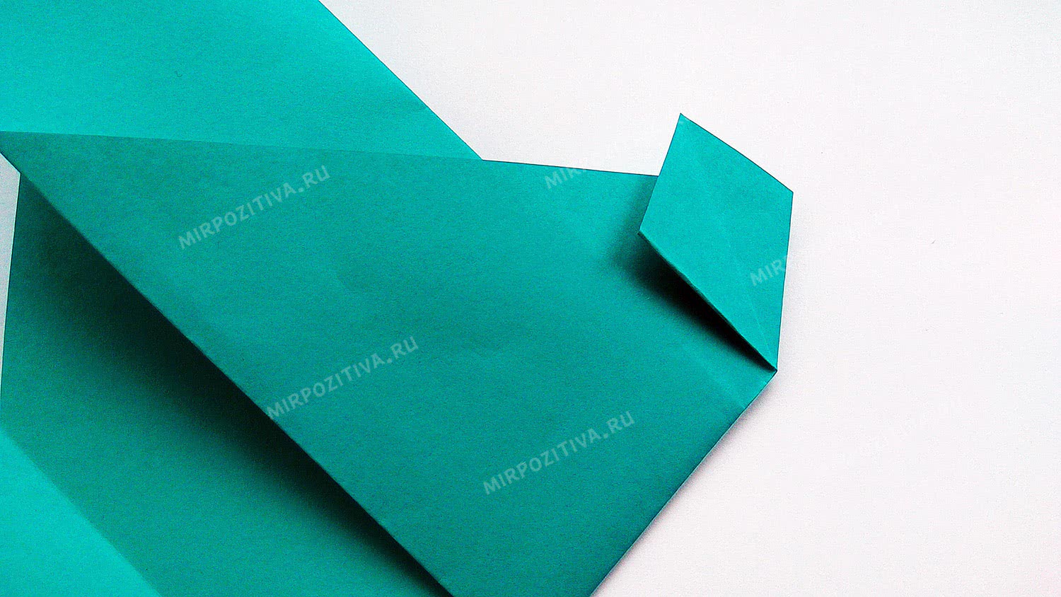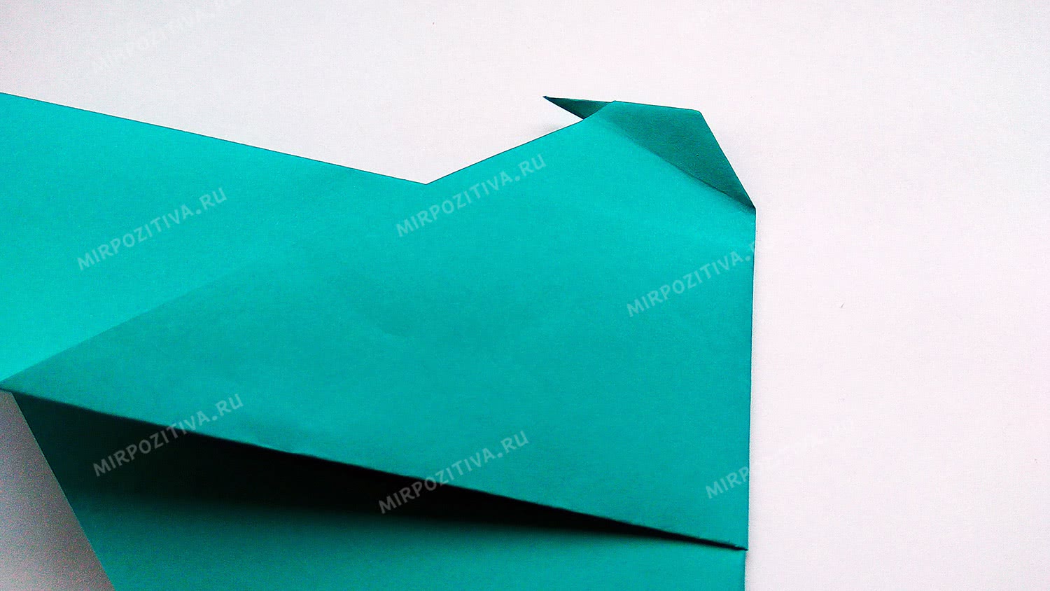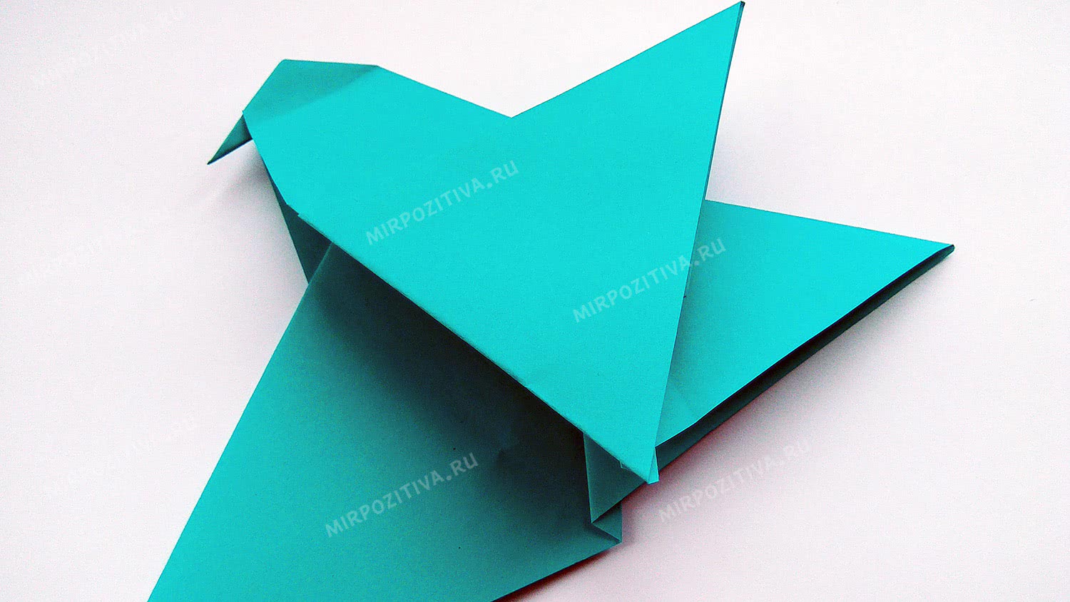 Шаг 13. Разгладьте бумагу в таком виде, и фигурка уже похожа на птицу. Есть широкая голова с маленьким острым клювом, есть 2 больших крыла, хвост, а внизу пока выделены выступы ног.