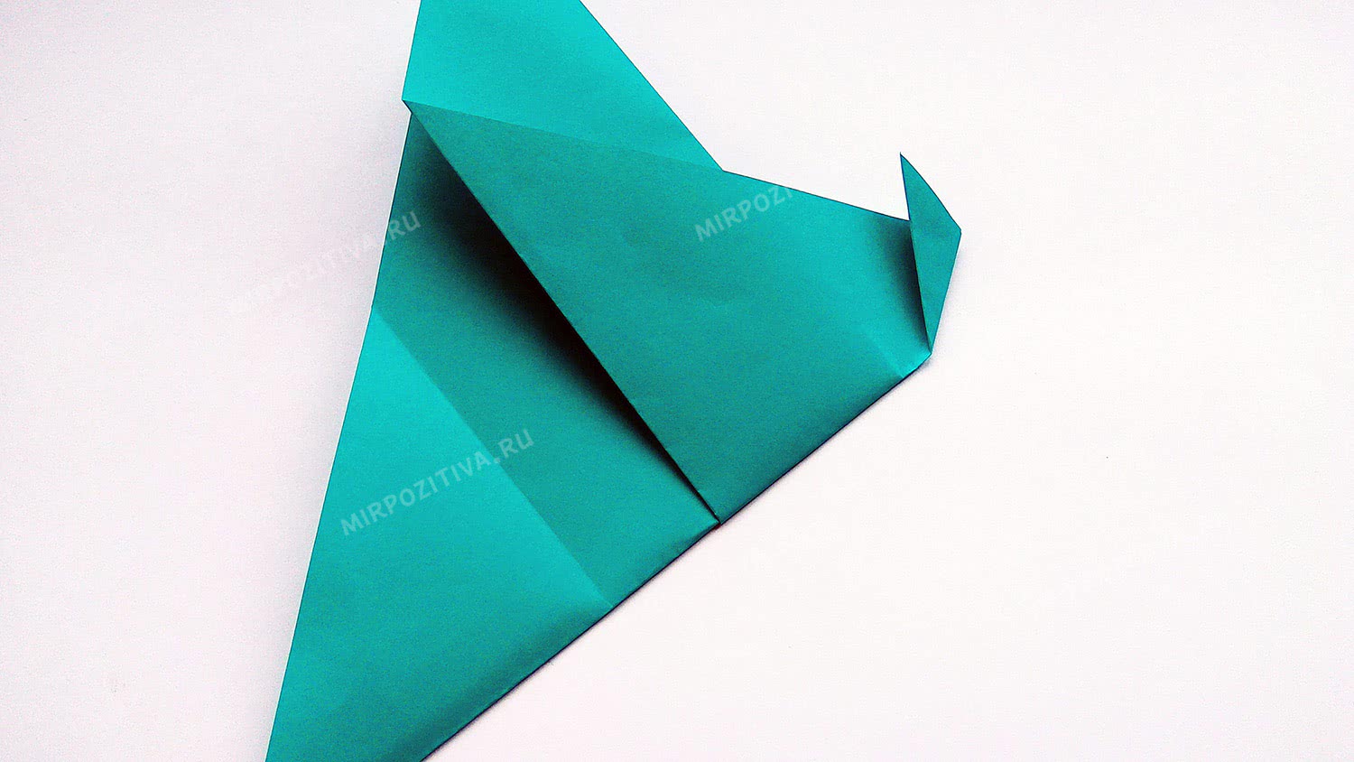 Сгибаем один острый угол к точке, как показано на фото. Это будет голова и шейка птицы (фото 8).