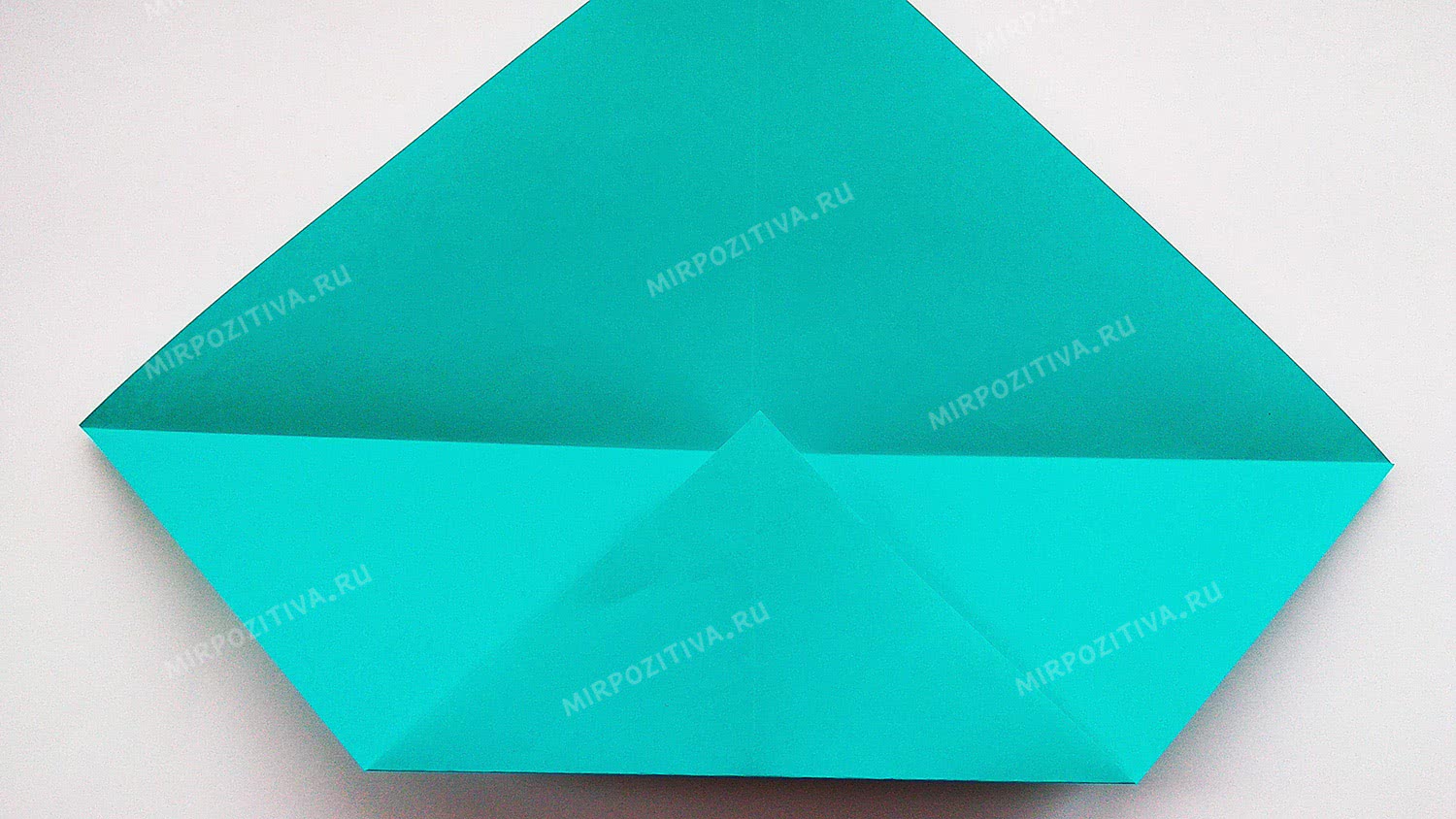Шаг 4. Теперь согните опять квадрат пополам, подняв основанием вверх равнобедренный треугольник, и верхнюю часть сложите, отступив примерно на треть сверху, сделайте загиб.
