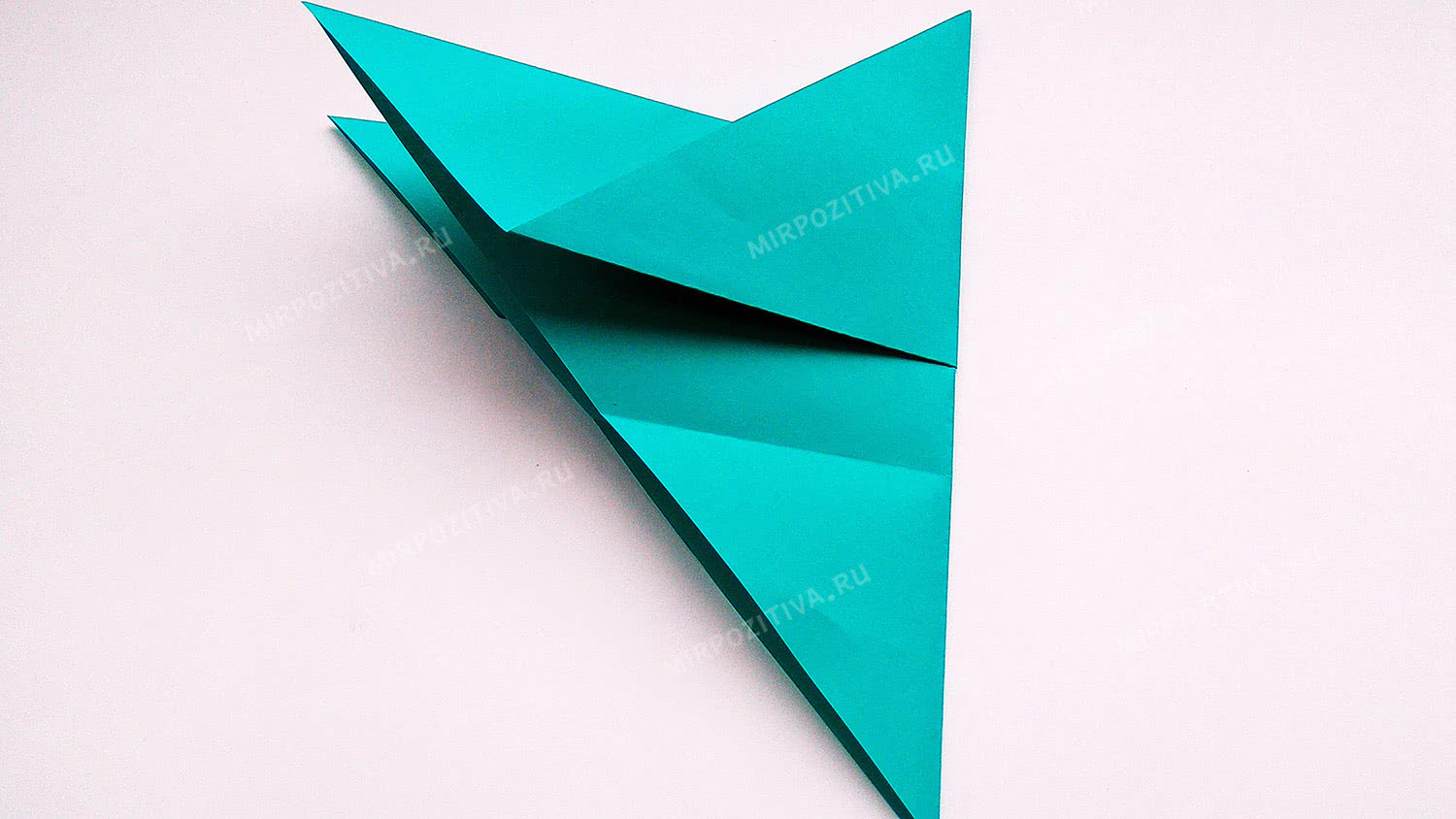 По полученным линиям концы ромба опять потребуется согнуть, но уже внутрь, и с любой из сторон самый кончик тоже загибается на 45 градусов — это будет головой птицы. Финальным шагом становится опускание «крыльев», т.е