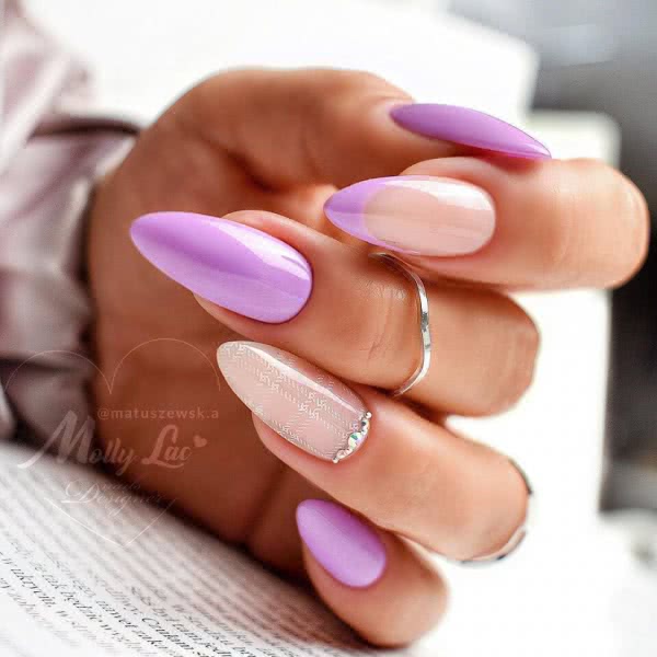 - Насыщенный фиолетовый — веселый и яркий цвет, который особенно выделяется осенью, эффектно смотрится и на коротких и на длинных ногтях.