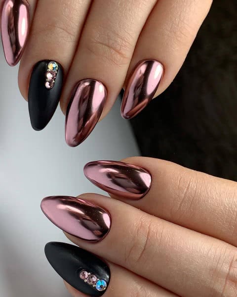 Также осенью будет очень актуален матовый финиш. Его можно выгодно сочетать с любыми цветами, дополнять им разные техники или экспериментировать, сочетая матовое и глянцевое покрытие. Минеральная текстура — довольно интересный тренд осени 2021 года. Ногти смотрятся завораживающе и по-особенному природно, будто кристаллы в разрезе. Не выйдет из моды и тренд в украшении ногтей на фольгу. Он смотрится ярко и празднично, особенно в дополнение к рисункам или экспериментам с покрытием. Однако не стоит перебарщивать. Дизайн с использованием фольги будет не слишком хорошо смотреться с конфетти или стразами.