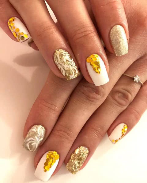 Блестки шикарно сочетаются с белым лаком, в 2020-2021 году вы можете использовать как классические цвета блесток — золотистые и серебристые, так и разноцветные варианты, которые будут не менее красиво смотреться на ноготках.