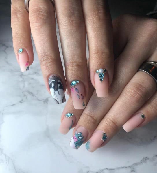 Во-первых, образ мечтательной красотки с развевающимися на ветру волосами и томным взглядом – это невероятно красиво и эффектно смотрится. Во-вторых, продублировать подобное изображение достаточно сложно, если конечно вы не используете слайдеры. И, в-третьих, маникюр подобного плана не только чудесным образом освежит ваш образ, но и подчеркнёт индивидуальность. Портретные изображения, как правило, украшают одновременно несколько ногтевых пластин. Дополнительно можно использовать жидкий глиттер с мелкими блёстками для прорисовки деталей, стразы или бусины.