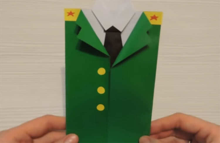 Некоторые простые открытки не требует подробного описания. Следующий вариант делается из 3 деталей: основа из сложенного пополам лист, декор из прямоугольника, четь меньшего размера, и красного бантика. Можно прикрепить три пуговки или бусинки, имитируя рубашку.