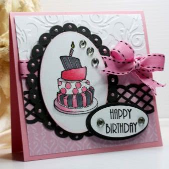 За основу можно взять картон нежно-вишневого оттенка, вырезаем из него прямоугольник. Далее берём картон в клеточку и вырезаем из него в произвольной форме фигуру до половины нашей вишнёвой основы, приклеиваем, место склеивания оформляем изысканным белым кружевом. Декорируем открытку бантиками, бусинками и пуговицами, добавляем добрые искренние поздравления и наш сюрприз для любимой мамы готов!
