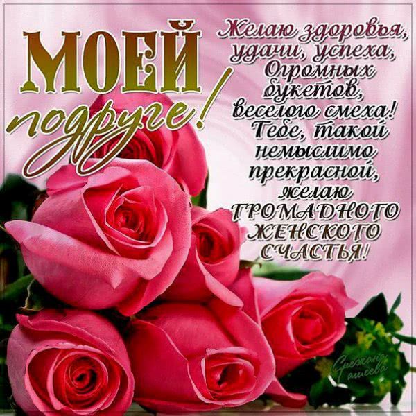 Моя дорогая подруга! Пусть исполнятся все твои желания, удачи тебе во всех делах и настоящего женского счастья. Сотни улыбок, солнечных дней и прекрасного настроения сегодня и всегда! С днем рождения!