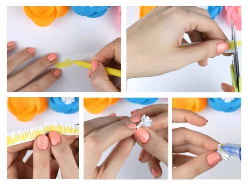 - С помощью кисточки сгибаем каждый лепесточек. Делаем еще одну заготовку из большого квадрата и склеиваем две заготовки вместе, клей наносим ровно по центру.