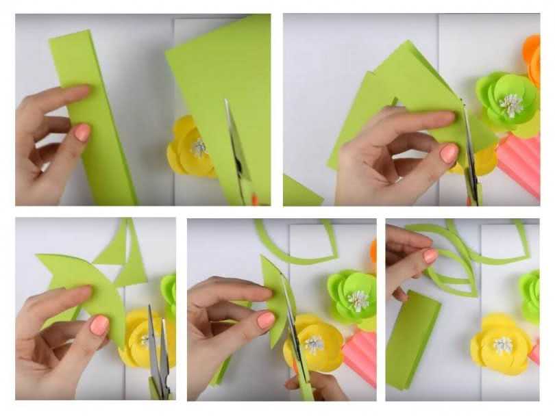 - Из двусторонней цветной бумаги с помощью ножниц вырежем листья, цветы и стебли
