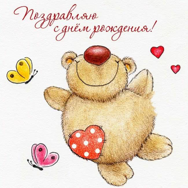 Красивым шрифтом написано немного приятных слов для именинницы, а мишка уже готов дарить подарок