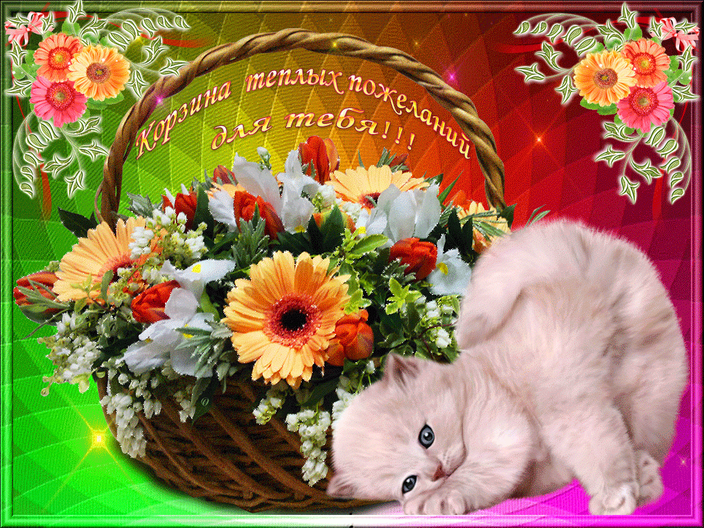 Котик моргает с увеличенной частотой, ещё бы, ведь букет так сияет!
