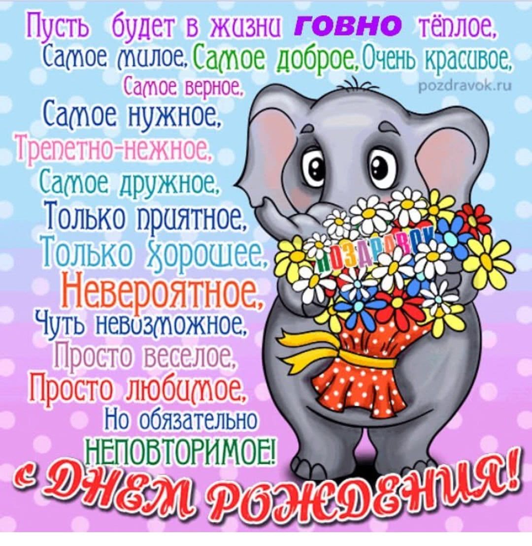 2. ___, прими мои скромные поздравления с твоим главным праздником в году. Пока оно сочинялись, пришлось, от смущения, перелопатить носком обуви полторы тонны асфальта. Но это того стоило. Наверное. С Днём Рождения! Цвети, порхай, ешь, молись, люби. Лишнее вычеркни сама.