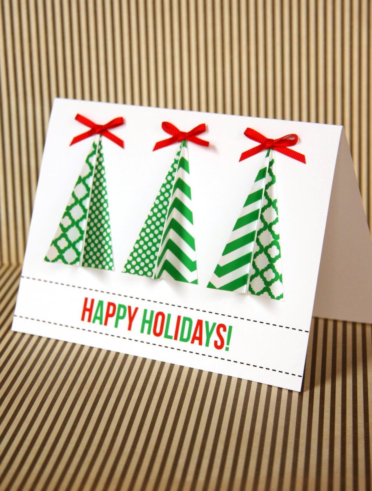 Если сделать елочку в стиле оригами, то можно особо ничего не выдумывать для дизайна новогодней открытки. Чтобы сделать такую елку, придется запастись терпением, ведь это немного сложнее, чем простая аппликация из цветной бумаги.