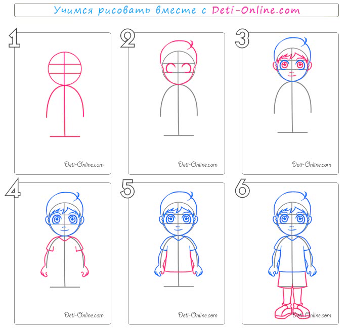 Инструкция в картинках поможет научиться рисовать симпатичного маленького мальчика.
