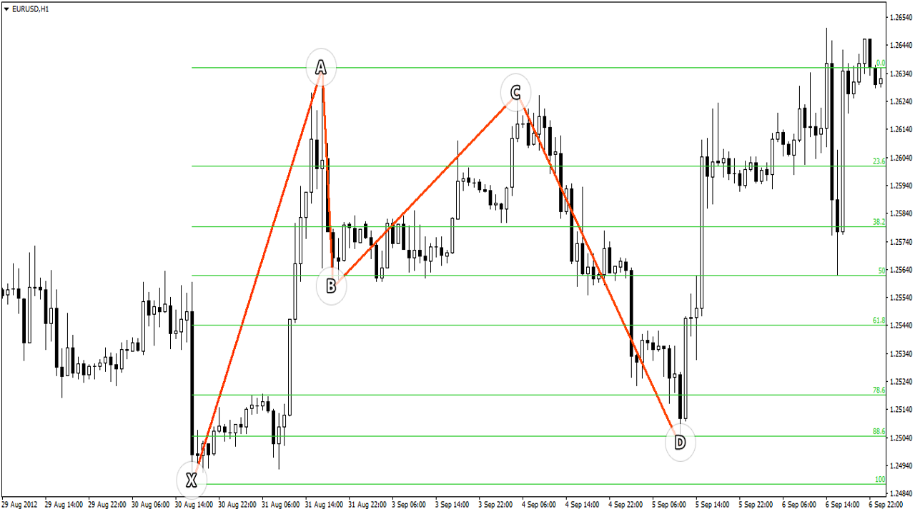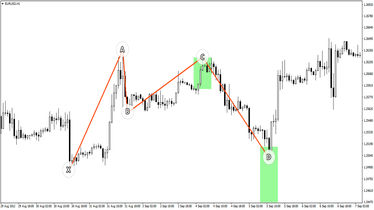Формирование паттерна начинается с колена XA – самого длинного движения в рассматриваемой фигуре. На коррекции мы ожидаем движения в 38.2% – 50% от XA. Таким образом, точка B никак не может оказаться ниже точки X. В случае бычьей формации точка C представляет собой понижающийся максимум, либо повышающийся минимум в случае медвежьего паттерна. Размер коррекции по отношение к AB должен составлять от 38.2% до 88.6%. Завершающее колено CD должно находится в пределах расширения 161.8% – 261.8% от BC. При этом вход осуществляется при достижении ценой 88.6% от колена XA.
