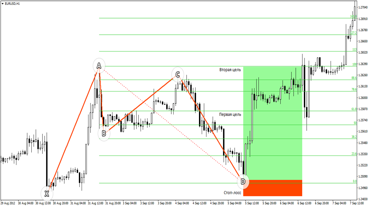Для определения целей растягиваем сетку от точки A до D. Первая цель будет находится на уровне 61.8%, вторая на уровне точки A. Стоп лосс устанавливаем чуть ниже точки X.