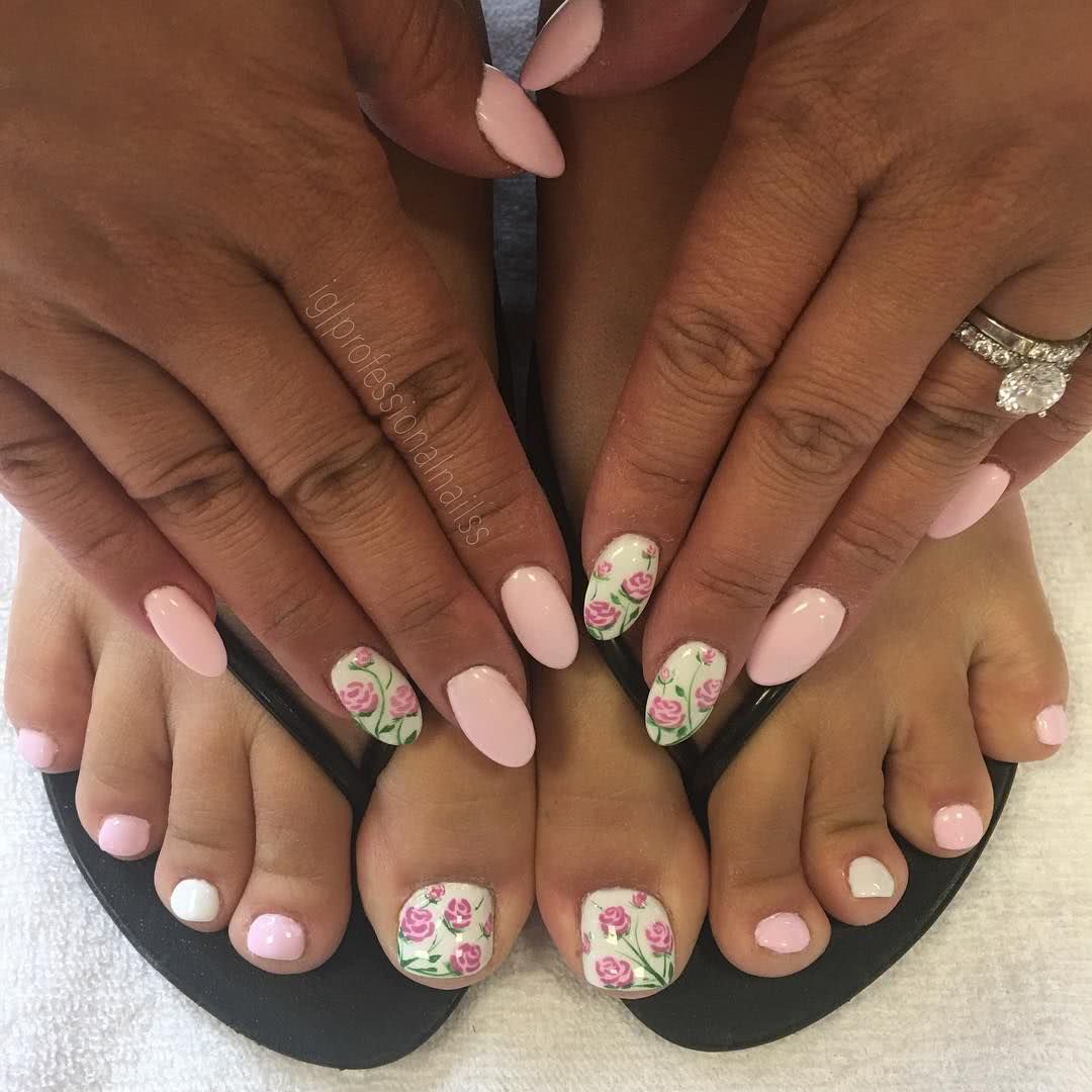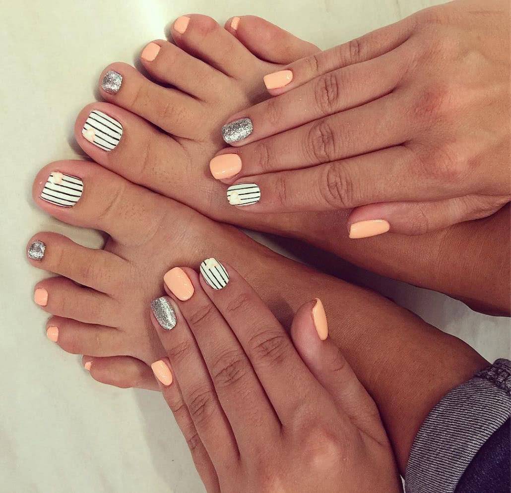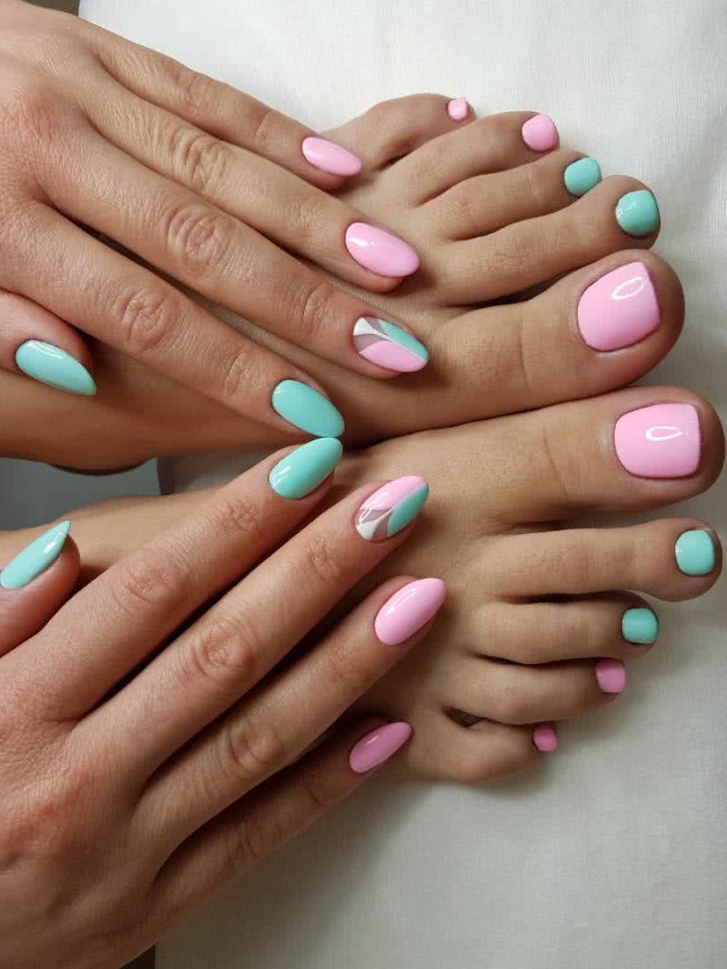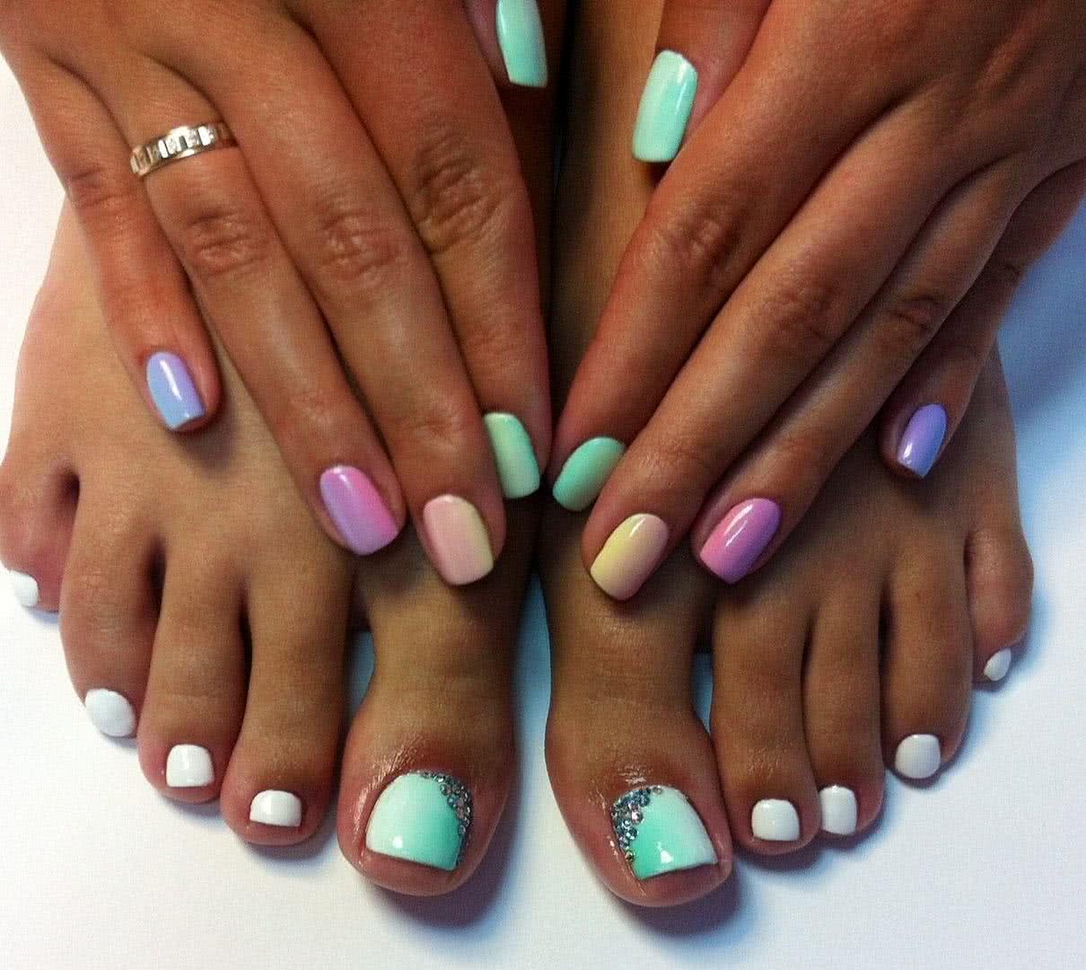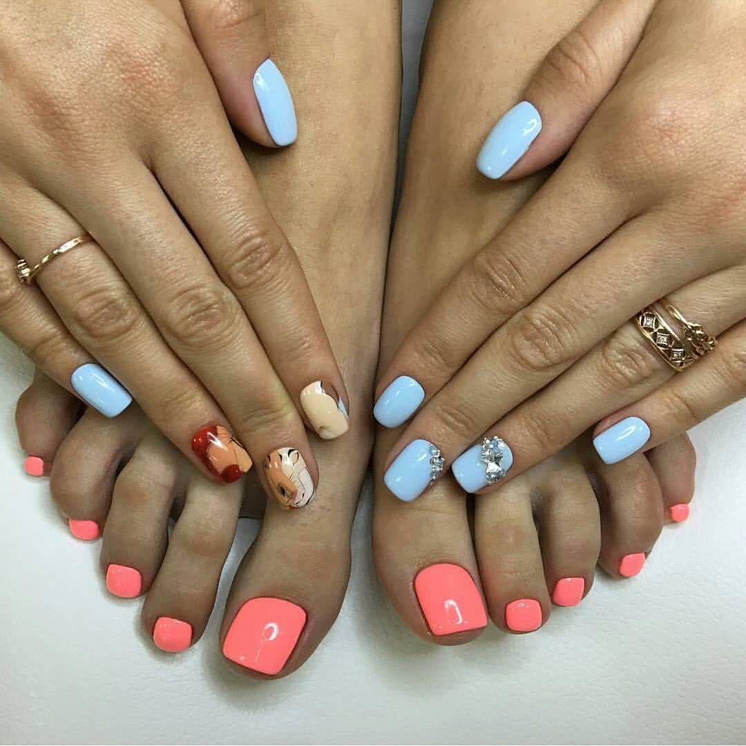 Благодаря своей уникальной способности универсально сочетаться с любыми нарядами, пастельная палитра в дуэте маникюра и педикюра, является в летнем сезоне мега востребованной. Модное оформление в стиле нюд предполагает использование бледно-розового, кремового, бежевого и любых других оттенков пастельной палитры. Этот вариант станет идеальным решением как для нежных и романтических барышень, так и для любительниц более броского дизайна. Пастельный тандем маникюр-педикюр очень красиво смотрится с акцентными ноготками, которые можно украсить кусочками слюды, стразами, блёстками глиттера либо рисунками, например, кружевным узором, геометрическими фигурами или абстракцией.
