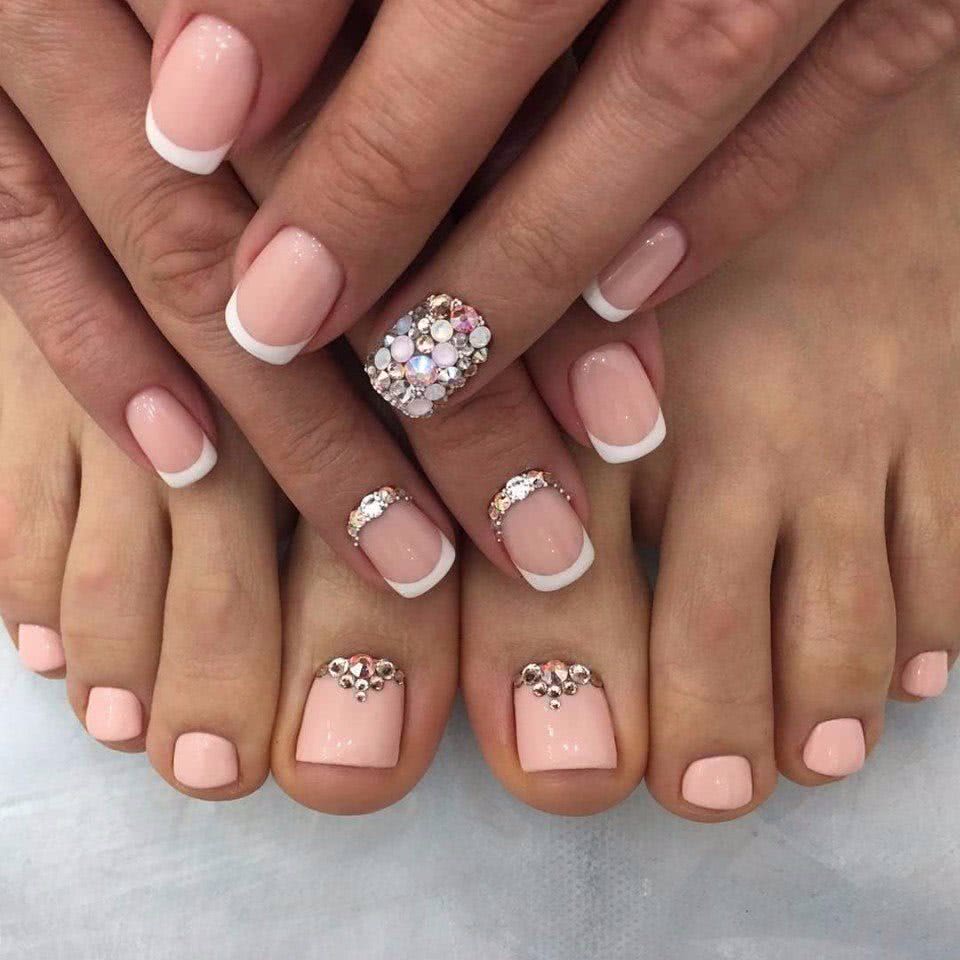 Французский дизайн считается незаменимой классикой, которая способна невероятно перевоплощаться и дополнять любой женский образ. Оформление этой идеи в летнем маникюре-педикюре для сезона 2020 предоставляет модницам абсолютную свободу при выборе оттенков и формы улыбки. Помимо классического белого кончика ногтевых пластин, линия улыбки может оформляться любым другим цветом, как и основание, и быть двойной, в виде узоров или конверта, как вам больше нравится. Французский маникюр-педикюр также можно дополнительно освежить при помощи аккуратных рисунков на руках или ногах либо блестящими элементами декора.