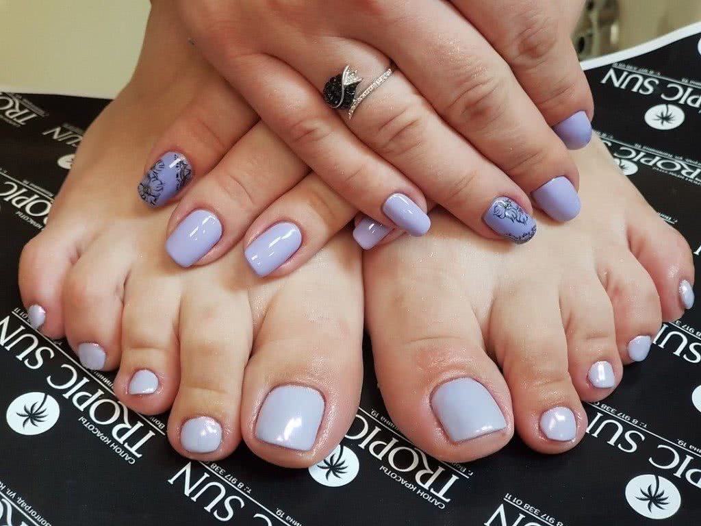 Нежный педикюр отлично сочетается с матовым покрытием. В зависимости от того, какой выбран оттенок лака, дизайны ногтей выполняются таким образом, чтобы рисунок (украшения) не сливались с основным фоном. Для этого модницы покрывают ноготки с модными педикюрами матовым топом, а однотонное покрытие оставляют глянцевым.