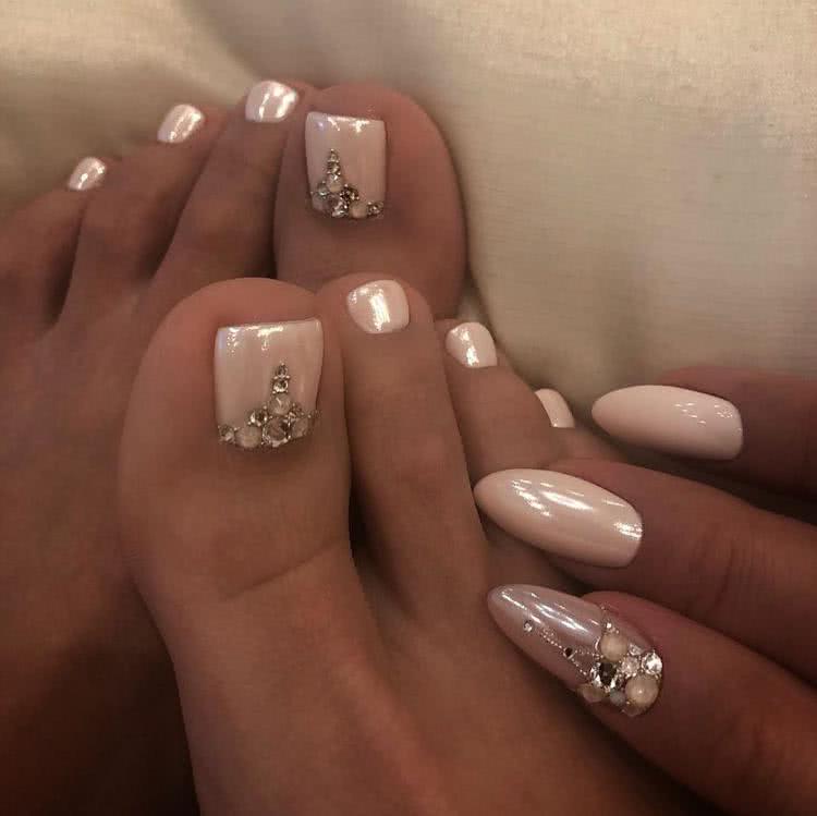 Если же вы хотите разместить на пальчиках ног яркие блестящие стразы, помните, что их не должно быть много. Всё же для нежных дизайнов свойственен минимализм, а не вычурность.