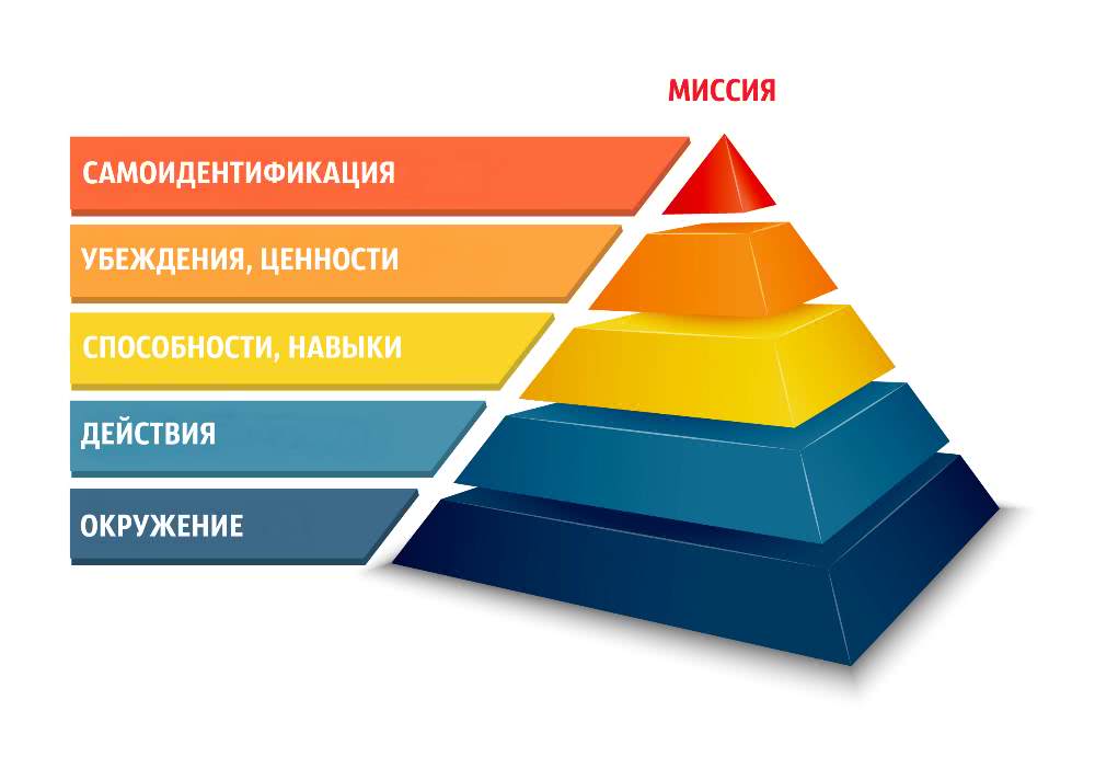 Уровни пирамиды Дилтса: Окружение, Поведение, Способности, Ценности и убеждения, Идентичность, Миссия.
