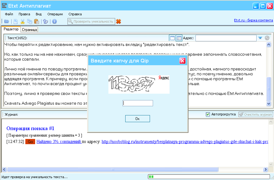 Для проверки больших текстов, типа дипломной или курсовой работы, следует скачать бесплатную программу, которая способна провести стандартную, экспресс и глубокую проверку. Единственное неудобство – это необходимость периодического введения капчи. Правда, система эта для проверки студенческих работ не предназначена. После обработки текста приложение выдает отчет, в котором выделены неуникальные фрагменты и указаны источники, откуда они были позаимствованы.