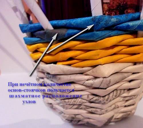 Ниже приведен пример плетения корзинки из газетных трубочек. Фото дополнены комментариями, которые помогут правильно выполнить рабочие операции.