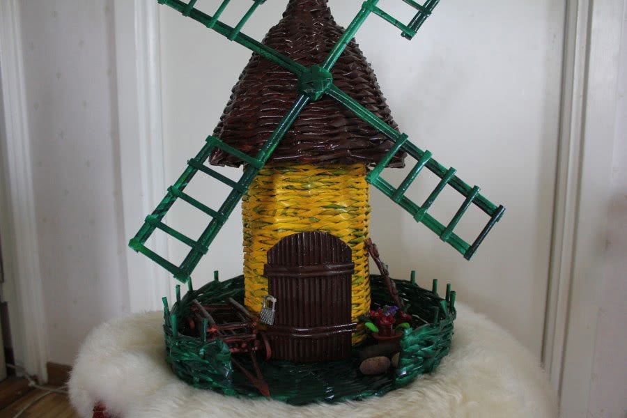 Красить каждую трубочку кисточкой — долго и муторно, поэтому ищут длинный лоток, в который укладываются трубочки. В него наливается краска, в нее опускаются готовые газетные трубочки. Затем их выкладывают на слой полиэтилена для просушки.