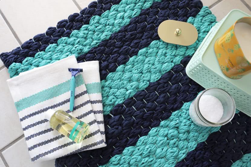 Если вы решили сделать разноцветный ковер из футболок разных оттенков, то он отлично подойдет для ванных комнат, где часто купаются дети. Кроме того, при правильном комбинировании разноцветных полос, можно выполнить несложный узор на вашем коврике.