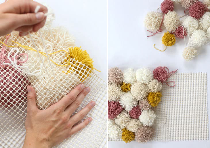 Помпоны можно привязывать к любой сетке. Лучше всего подойдет противоскользящая подложка под ковер. Можно взять кусок резиновых ковриков, которые продают для ванных на метраж. В них тоже есть отверстия, но они намного меньше. Чем хороши эти варианты? Они не скользят.