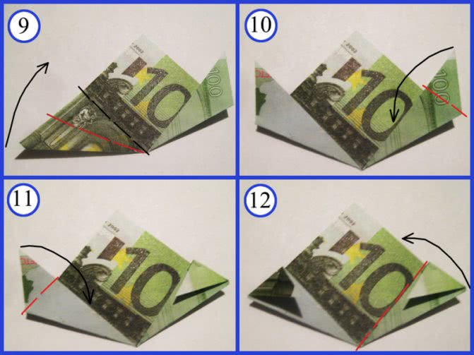 5. Теперь вам нужно начать крепить банкноты. Для начала нужно сложить деньги так, как показано на картинке.