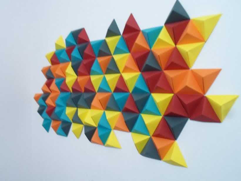 Это отличная идея украсить интерьер комнаты объемной композицией, такое панно — пирамидки может стать центральным элементом декора любого помещения. Для него потребуется: плотная цветная бумага или бумага для оригами, линейка, ножницы, клей.