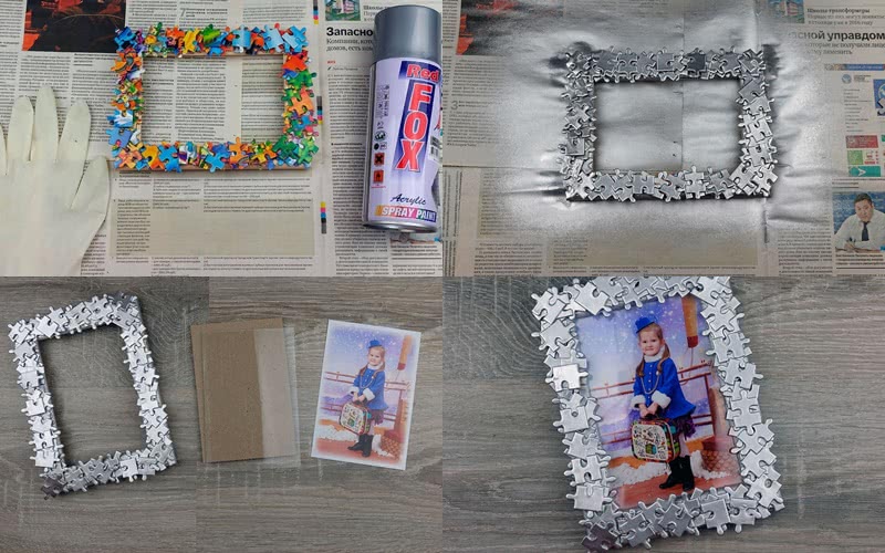 Для создания креативной рамки потребуется найти любые ненужные паззлы среднего размера и красивую краску в распылителе. Оттенок может быть любым: серебряным, золотистым и т. д. на ваше усмотрение.
