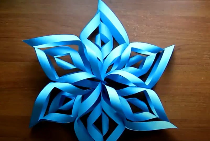 - Затем склеиваем между собой все лучики и получаем красивую объемную снежинку.