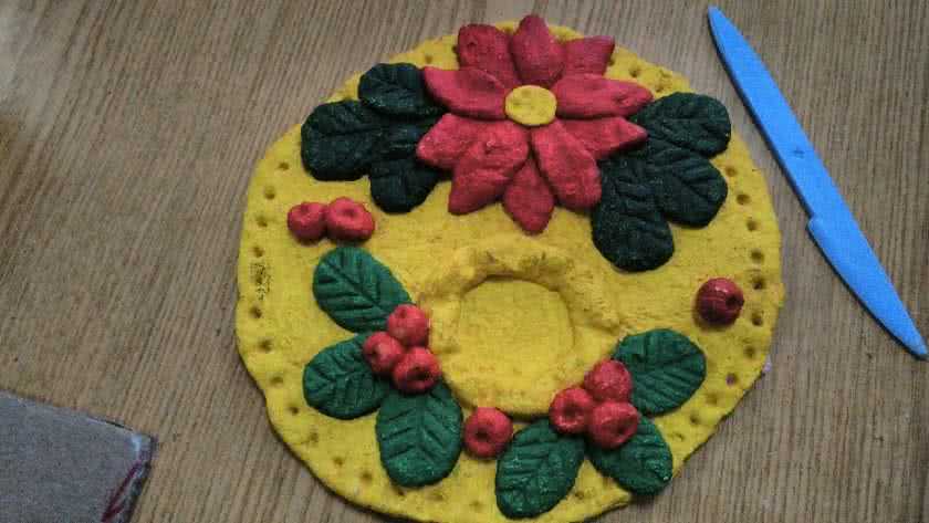 Раскатайте тесто желтого и выбранного цвета. Вырежьте один круг желтого теста и несколько кружков теста выбранного цвета. Смажьте картон клеем ПВА. Приклейте по центру желтый круг, а вокруг него остальные кружочки.