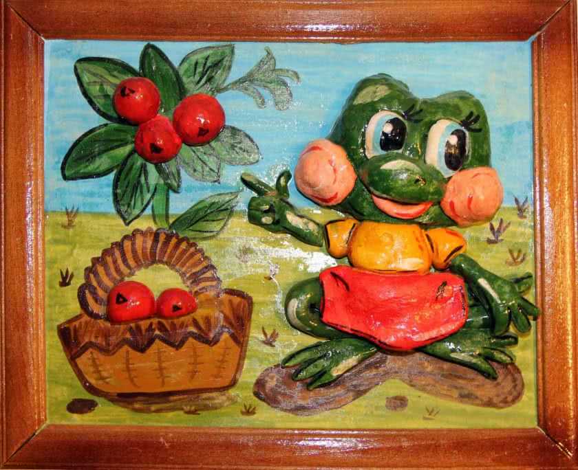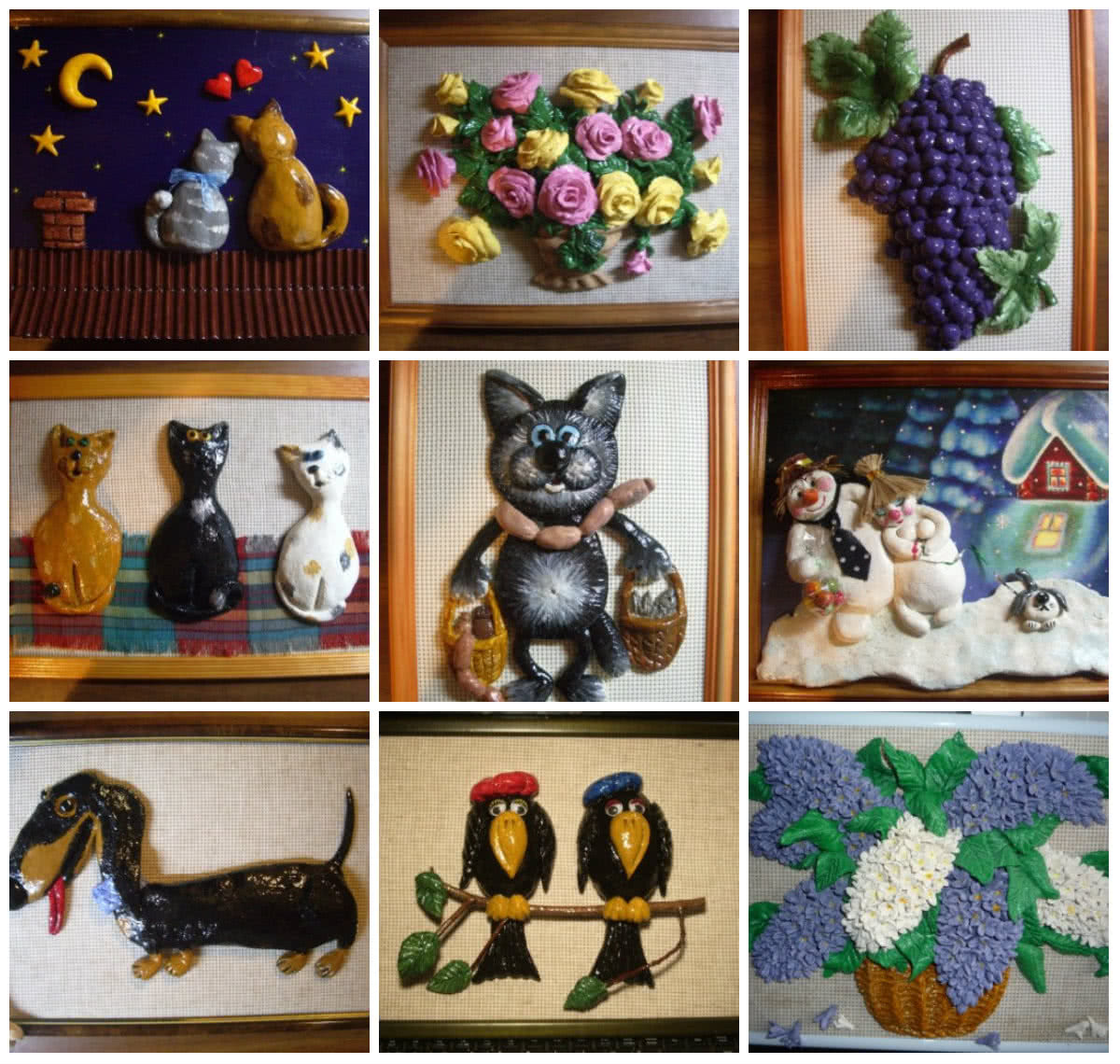 Такие сюжеты сразу притягивают взгляд, выгодно оживляя обстановку. Зал преобразят цветочные композиции, кухню – кулинарные изображения, а детскую – герои мультиков, рыбки, зверушки. Картины из теста это пейзажи, натюрморты, растения. Силуэты воссоздают на пергаментной бумаге, заполняя их исходным сырьём, а в высушенном состоянии приклеивают к картонному основанию. Использование нескольких слоёв гарантирует картинке выпуклость.