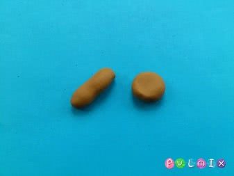 - Из бежевого пластилина лепим круглые булочки. Не забываем про достоверность: нижняя половинка должна быть плоской, а верхняя закругленной. Можно слепить шарик и аккуратно его разрезать, сплющив одну из сторон.