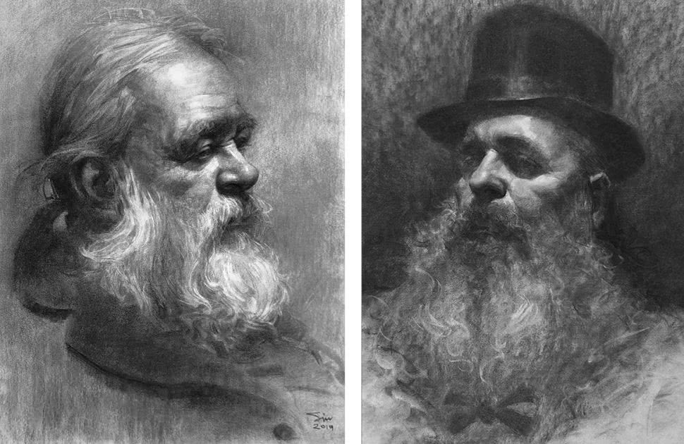 Обратите внимание на форму бороды и приучите глаза замечать, что у волос нет четких краев, как у дыма. Вместо того чтобы рисовать отдельные волоски, относитесь к бороде как к свету и тени, сохраняя края мягкими