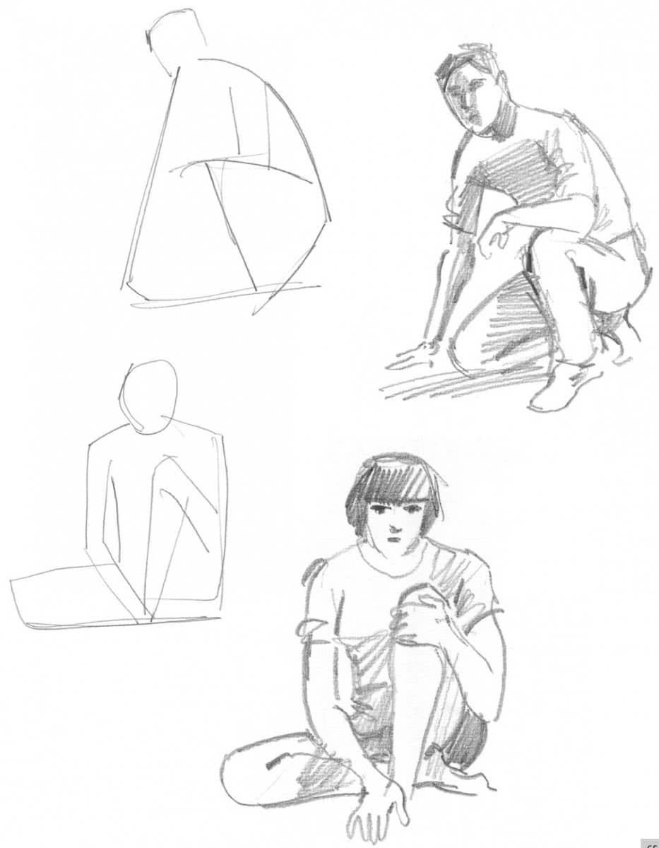 К следующим четырем рисункам подходим несколько иначе, чем к тем, которые вы видели до этого, потому что я разбил фигуру на блоки, а не передал движение с помощью нескольких линий. Это заставило меня взглянуть на них немного по-другому, потому что теперь я сосредоточиваюсь на объеме и форме. Удобно, что эти люди находятся в достаточно устойчивом положении, так что у вас есть больше времени на то, чтобы внимательно рассмотреть их и нарисовать.