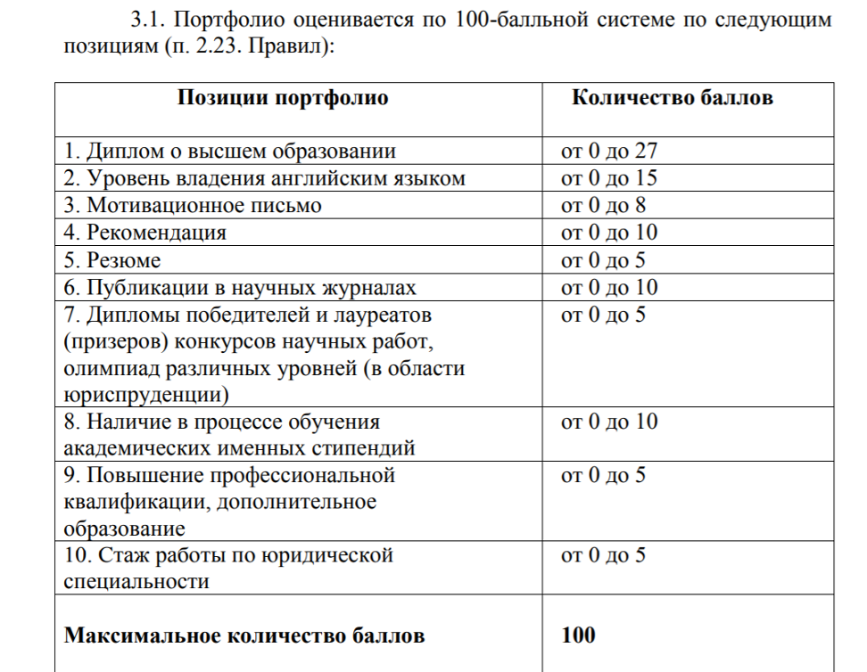 Состав и критерии оценивания портфолио на магистерскую программу «Международное частное право и международный коммерческий арбитраж» в НИУ ВШЭ